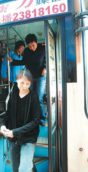 台湾の第12代総統選挙で当選した馬英九氏の夫人である周美青氏が24日、バスから降りている。兆豊金融公社の法務処長として働いている周夫人は、夫の総統当選以降も通常通りに質素な姿でバスに乗って銀行に通っており、話題になっている。