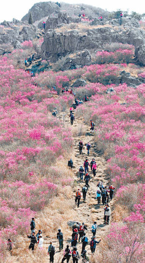 3日、つつじフェスティバルが始まった全羅南道麗水市(チョンラナムド・ヨスシ)ヨンチィ山頂上付近で、満開のつつじが登山客たちと調和を成して壮観を演出している。麗水ヨンチィ山のつづじフェスティバルは6日まで開かれる。