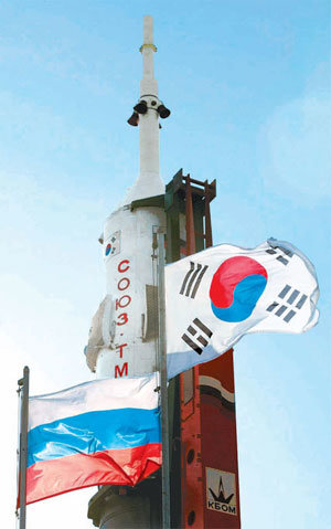 韓国初の宇宙飛行士、李ソヨン氏が乗って宇宙に向うロシアのソユーズ号を積んだロケットが6日(現地時間)、カザフスタン・バイコヌル宇宙基地内のロケット発射台に設置された。発射台の前に太極(テグク)旗とロシア国旗が並んで掲揚されている。同ロケットは8日午後8時16分(韓国時間)に打ち上げられる予定だ。
