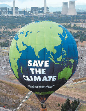 オーストラリアの科学者らが気候変動報告書を政府に提出する締め切り日を翌日に控えた9日、非政府組織(NGO)の環境保護団体「グリーンピース」が、ニューサウス・ウェールズ州のリデル&ベースウォーター石炭火力発電所の上空で、「気候を守ろう」というスローガンが記された熱気球を飛ばしてデモを行った。