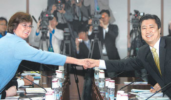 米国産牛肉の輸入問題をめぐる韓国と米国の交渉が6ヵ月ぶりに再開された。11日、政府果川(クァチョン)庁舎で開かれた、米国産牛肉の輸入条件の改定に向けての韓米専門家交渉で、閔東石(ミン・ドンソク)農業通商政策官(右側)がテルプストラ米農業次官補と握手をしている。政府は、今回の交渉で米国側と妥協点を見出すことができれば、内部調整を経て、早ければ来週中にも米国産牛肉の輸入再開を正式に発表する予定だ。