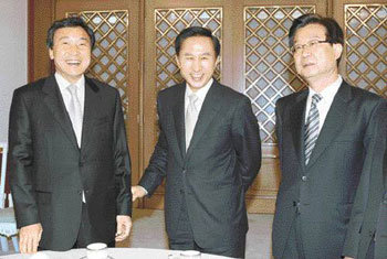 이명박 대통령(가운데)은 24일 한나라당 강재섭 대표(오른쪽)와 통합민주당 손학규 공동대표 등 여야 지도부를 청와대로 초청해 미국 일본 순방 결과를 설명하고 국회의 협조를 당부했다.