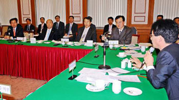 ハンナラ党の劉承旼(ユ・スンミン)議員(右)ら与野党議員14人で構成された「革新都市推進国会議員の会」は1日、国会で、鄭鍾煥(チョン・ジョンファン)国土海洋部長官や鞖国煥(ペ・グクファン)企画財政部次官ら政府関係者と懇談会を開き、革新都市政策の滞りない推進を訴えた。