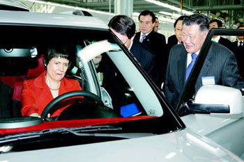 現代起亜(ヒョンデ・キア)グループの鄭夢九(チョン・モング)会長が17日、京畿道華城市(キョンギド・ファソンシ)にあるナムヤン研究所を訪問し、「トゥサン」燃料電池車に乗ったニュージーランドのヘレン・クラーク首相にエコー軽自動車の技術について説明している。