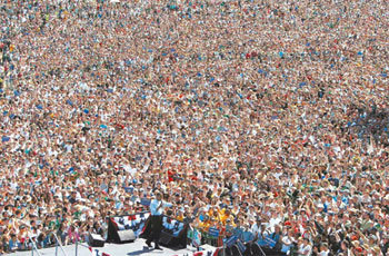 18日、ポートランドのウォーターフロント公園に群集した聴衆の前で、大統領選の民主党候補指名争いで優位に立つバラック・オバマ上院議員が演説を行っている。オバマ議員は20日、オレゴン州の予備選挙が終了すると、指名争いでの勝利を宣言した後、共和党のジョン・マケイン候補と本番で対決を繰り広げるものと見られる。