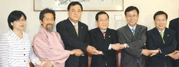 統合民主党と自由先進党、民主労働党など野党3党は30日午前、国会の統合民主党院内代表室で6人会談を開き、政府の「米国産牛肉の告示」無効化のために憲法訴願を提出することにした。右から権善宅(クォン・ソンテク)先進党院内代表、元惠榮(ウォン・ヘヨン)民主党院内代表、崔仁基(チェ・インギ)民主党政策委議長、柳根粲(リュ・グンチャン)先進党政策委議長、姜基甲(カン・ギガプ)民主労働党院内代表、李正姫(イ・ヒジョン)院内副代表。
