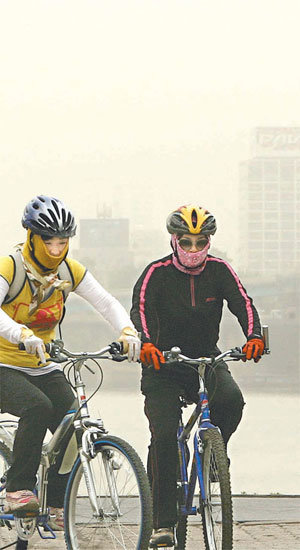 30日、ソウル永登浦区汝矣島(ヨンドゥンポグ・ヨウィド)の漢江(ハンガン)辺で市民たちが黄砂を避けるためにマスクとタオルで鼻と口を覆ったまま自転車に乗っている。同日、中部地方には黄砂注意報が下された。