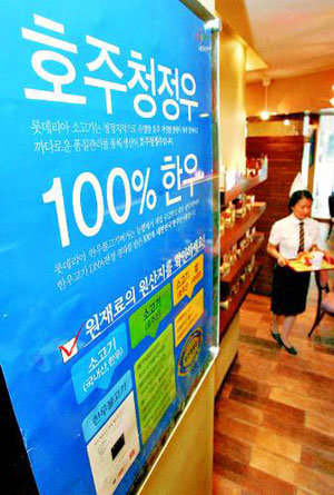 ファーストフード店のハンバーガーや構内食堂の牛肉メニューにも、原産地の表示を義務づける原産地表示制が拡大・施行された。23日、ソウル中区(チュンク)のロッテリア市庁店は、ハンバーガーの牛肉に、オーストラリアの清浄牛と韓国牛だけを使うという内容のお知らせをドアに貼りつけた。