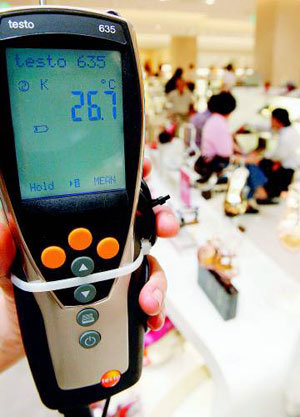 6일 서울 중구 충무로1가 신세계백화점 본점의 실내 온도가 26.7도를 가리키고 있다. 신세계백화점 측은 최근 고유가 때문에 백화점 실내 온도를 예년보다 2, 3도 올렸다고 밝혔다.