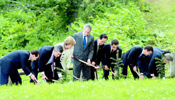 日本の洞爺湖で行われている主要8カ国(G8)の拡大首脳会議二日目の8日、各国の首脳たちは宿舎の「ザ・ウィンザーホテル洞爺」で開かれた植樹行事に、揃って出席した。左からベルルスコーニ・イタリア首相、ブラウン英首相、メルケル・ドイツ首相、ブッシュ米大統領、福田康夫日本首相、サルコジ・フランス大統領、メドベージェフ・ロシア大統領、ハーパー・カナダ首相やバローゾ欧州連合執行委員長。