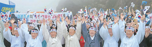 14日、独島(トクト、日本名竹島)で開かれた「日本の独島挑発糾弾大会」で慶尚北道(キョンサンブクド)の金寛容(キム・グァンヨン)知事(右から4番目)をはじめ参加者たちが手に太極旗(テグッキ)を持って万歳を叫んでいる。日本が中学校学習指導要領の解説書に独島の領有権を主張する記述をすることを決めたことに対し、「日本の独島挑発は、韓日関係の信頼を崩す行為だ」とし、「青少年に正しい歴史観を伝えるために、日本の最低限の良識を守るべきだ」と非難した。この日の糾弾大会には、金知事をはじめ、李相千(イ・サンチョン)道議会議長、趙炳仁(チョ・ビョンイン)慶北道教育監、尹在玉(ユン・ジェオク)慶北地方警察庁長、鄭胤烈(チョン・ユンヨル)鬱陵(ウルン)郡長ら90人あまりが参加した。