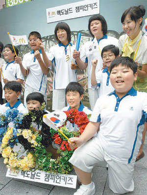 韓国マクドナルドは25日、ソウル鐘路区貫勳洞(チョンログ・クァンフンドン)の韓国マクドナルド本社で、北京五輪を観覧する「マクドナルドキッズ」出場式を行った。マクドナルドキッズは、韓国五輪委員会が推薦した将来の五輪有望株10人と障害者の水泳選手2人を含め、20人の子供で構成されており、マクドナルドがスポンサーする。
