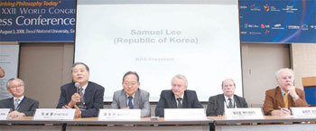 30日、ソウル大のシンヤン学術情報館で世界哲学大会の韓国組織委員会と国際哲学連盟の関係者らが記者会見を開き、大会について説明した。左から金ヨス組織委員会顧問、李サムヨル韓国哲学会長、李明賢(イ・ミョンヒョン)組織委員会議長、国際哲学連盟(FISP)のぺテル・キャンプ会長、ウィリアム・マックブライド事務総長、ジルベル・オトゥア学術委員長。