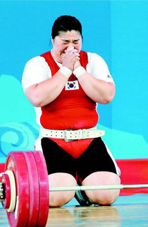 金メダルを確定付けた瞬間は表情に何ら変化がなかった。彼女の目は金メダルの向こうの世界新記録に向けられていた。女子重量挙げの看板、張美蘭(チャン・ミラン)が16日、中国北京の航空航天大学体育館で行われた北京五輪女子重量挙げ75キロ超級で、ジャーク3回目の試技で世界新記録を4キロも上回る186キロを持ち上げた後、両手を合わせてお祈りをしている。