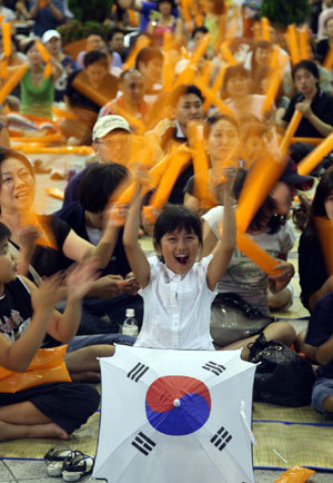 16日、女子重量挙げ75キロ以上で張美蘭(チャン・ミラン)が金メダルを取ると、京畿道高陽市一山(キョンギド・コヤンシ・イルサン)のウェスタンドーム・イベント広場に集まった市民たちが歓呼している。