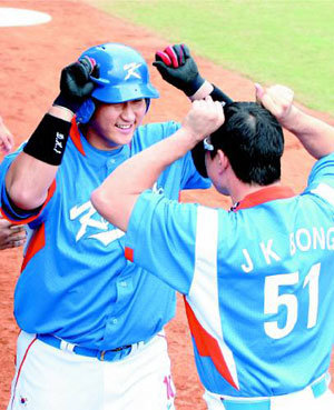 韓国野球代表チームの李大浩(イ・デホ)選手(左)が、オランダとの予選フルリーグ最終戦の1回表に2ランを放ち、ホームを踏んだ後、奉重根(ボン・ジュングン)とハイタッチをしている。韓国は10対0で8回コールド勝ちし、予選を7戦全勝で締めくくった。