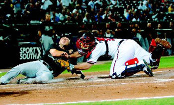 アトランタの捕手ブライアン・マッキャン(右)が、6回表、ホームに跳び込んできたフロリダのポール・ロデューカを間一髪でアウトにした。アトランタが4対2で勝利。