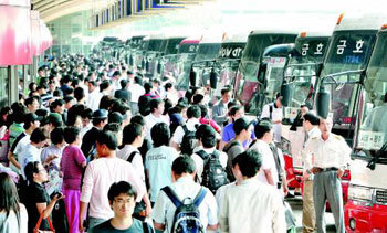 道路が渋滞し、故郷への道は遠くても、思いははせるばかりだ。秋夕(チュソク=旧暦8月15日の節句)の連休前日の12日午後、帰省客で混雑し、足の踏み場もないソウル瑞草区(ソチョク)の高速バスターミナル・湖南(ホナム)線乗り場。同日昼の時間は、高速道路の車の流れが比較的スムーズだったが、午後遅くには、仕事を終えたサラリーマンの帰省客が集中し、京畿(キョンギ)地域の高速道路の下り線の各所で、渋滞となった。