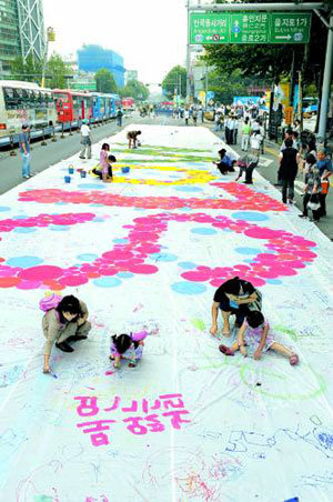 「車のない日」である22日、ソウル鍾路区(チョンログ)鐘路1街の車道で、子どもたちが白い布に絵を描いている。「車のない日」の1日だけでも乗用車に乗らず、公共交通機関を利用して、大気汚染と交通渋滞を減らそうという趣旨で、行われたキャンペーン。同日、ソウルを含めて世界約40ヵ国、2020の都市で同時に進められた。