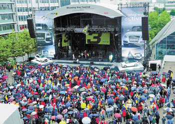 地域社会と企業が相互に協力しながら「ウィンウィン」の相乗関係を結んでいる世界各国の企業都市のプレゼンスが、グローバル経済危機の現状の前でさらに高まっている。ドイツのインゴルシュタット市に拠点を置くアウディが7月、本社ビルの隣の「アウディ・フォーラム」で開催した「シュッティング・スター・フェスティバル」。雨の降る悪天候にも関わらず、大勢の市民が集まって、公演を楽しんでいる。