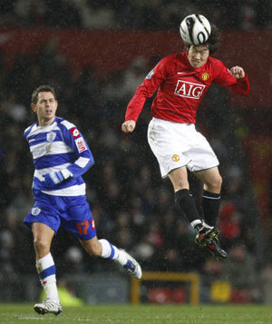 12日、クィーンズパーク・レインジャズとの試合にマンチェスター・ユナイテッドの朴智星(バク・チソン、右)がジャンプしながらヘディング。同日、先発でフルタイム出場した朴智星は、後半11分、会心のシュートがゴールポストに当たってははじき出され、シーズン2号目のゴールはならなかった。