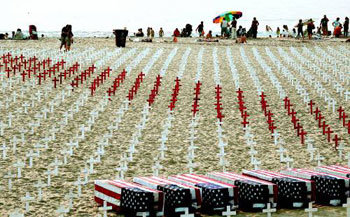 イラク戦争で命を落とした米軍兵士を称える十字架が16日、カリフォルニア州サンタモニカの海辺に並べられている。十字架の設置は04年2月に始まったが、ボランティアは今も毎週日曜日に戦死者の数の十字架を並べている。