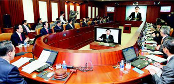 ブラジルを訪問中の李明博(イ・ミョンバク)大統領が18日午前、インターネットを通じて、画像でソウル鍾路区世宗路(チョンロク・セジョンロ)の政府中央庁舍で開かれた閣議に参加している。