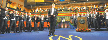 今年のノーベル文学賞受賞者であるフランス人作家のル・クレジオが10日、スウェーデンのストックホルムで開かれたノーベル賞授賞式で、受賞直後、熱い拍手を受けている。ノーベル化学賞、物理学賞、医学賞、経済学賞などのノーベル賞受賞者たちは同日、スウェーデン国王グスタフ16世から1000万クローナ(約16億9000万ウォン)の賞金とともに賞を授与された。