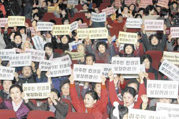 世界人権宣言採択60周年を記念する「08国連世界移住民の日、韓国大会」が14日、ソウル東大門区(トンデムング)慶煕(キョンヒ)大学で行われた。同日の行事に参加した外国人約1000人が「移住民の人権を保障せよ」という掛け声をかけながら、ピケットを振っている。