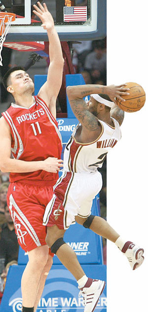 ヒューストン・ロケッツの「万里の長城」姚明(ヤオ・ミン、左側、229センチ)が手を高く上げたところに、シュートをしようとしたクリーブランド・キャバリアーズのモウ・ウィリアムスが一瞬戸惑いながら、パスするところを探している。クリーブランドが99—90で勝利した。