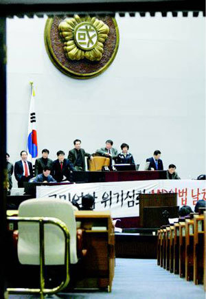 26日、与党ハンナラ党の法案単独処理を阻止するという名分で、国会本会議場を奇襲占拠した野党民主党議員が、国会議長席の周辺に「国民抑圧危機深化、MB(李明博)悪法強行採決、決死反対」と書かれたプラカードを持って、座り込みをしている。