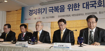 全国経済人連合会、大韓商工会議所、韓国経営者総協会、韓国貿易協会、中小企業中央会の経済5団体が5日、ソウル中区太平路(チュンク・テピョンロ)の韓国プレスセンターで開いた記者会見で、鄭炳哲(チョン・ビョンチョル)全国経済人連合会副会長(中央)が、「経済危機克服に向けた対国会声明」を朗読した。