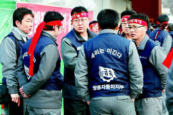 双竜(サンヨン)自動車が、法廷管理を申請した9日、京畿道平沢市七槐洞(キョンギド・ピョンテクシ・チルゲェドン)の双竜自動車の工場で、労組員たちが暗い表情で対策を話し合っている。双竜自動車労組は同日、「09年1月9日は中国が韓国を踏みにじった日」とし、双竜自動車の最大株主である上海自動車を強く非難した。