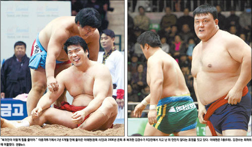 異種格闘技で、2年6ヵ月ぶりに復帰した李テヒョン(左)と06年の引退後に復帰した金キョンスが8回戦で負け、苦しそうな表情をしている。李テヒョンは6位、金キョンスは最下位となった。