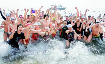 この冬最後の寒さが猛威を振るう中、15日、釜山海雲台(プサン・ヘウンデ)の海水浴場で開かれた第22回北極熊水泳大会で、参加者たちが水着姿で冬の海を全身で満喫している。大会には、水泳同好会の会員や外国人など約600人が参加した。