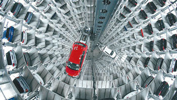 ドイツ・フォルクスワーゲンの本社があるヴォルフスブルク工場の「アウトシュタット」で12日、新車がエレベーターに積まれて出庫している。アウトシュタットは、透明なガラスでできた円形の壮大な出庫タワーだ。いっぽう、フォルクスワーゲンは、昨年の売上げが6.3%増加するなど、史上最大の実績を達成したが、今年は販売と売上げのいずれも減少が予想されると発表した。