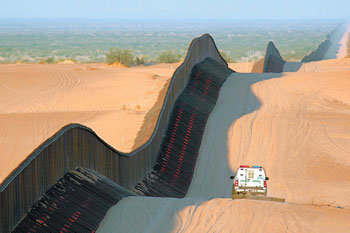 米国土安全保障省は最近、メキシコ北部地域の麻薬組織による暴力沙汰が、米国本土にまで影響しかねないと懸念し、国境守備要員を増やすなど、国境守備の強化に乗り出した。14日、メキシコと隣接している米カリフォルニア・キャレキシコの砂漠で国境守備隊が不法入国者の足跡の特定が容易になるよう、特殊車両を利用し、砂を平らにしている。
