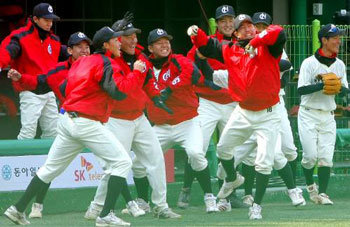清州(チョンジュ)高のチャ・スンフンが31日、ソウル木洞(モクドン)野球場で開かれた第63回黄金獅子旗・全国高校野球大会の中央(チュンアン)高との準々決勝で、1—2でリードされていた7回裏、2打点の逆転適時打を放ち、仲間たちが喜んでいる。昨年野球部が再創設された清州高は、中央高を4—2で下して準決勝に進む快挙を演出した。