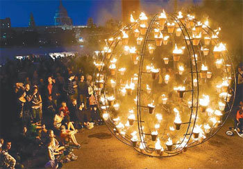 12日、英ロンドンで開かれているテムズ・フェスティバルに参加したフランスの芸術家が作った「火のガーデン」という作品が、テートモーダン美術館の屋外で明かりを灯している。テムズ・フェスティバルは12日と13日の2日間行われる。(ロンドン=AFP連合ニュース)
