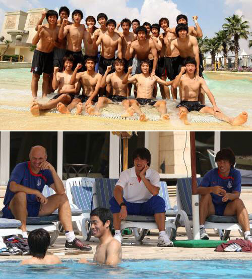 20歳以下(U20)ワールドカップ(W杯)代表チームが6日、エジプトのスエズに移動前、カイロにある宿舎のJWマリオットホテル内のプールで、回復訓練をしている途中、団体でポーズを取った。徐正源(ソ・ジョンウォン)コーチが、選手らに押され、プールに投げ込まれる場面も。代表チームは9日午後11時30分、ガーナと準決勝で激突する。