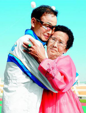 「国民マラソンランナー」李鳳柱(イ・ボンジュ、39=三星電子、左側)が21日、大田(テジョン)全国体育大会マラソンで、引退競技を優勝で飾った後、母親のコン・オクヒさん(74)と抱き合っている。コンさんは、韓服を綺麗に着込み、朝早くから息子の最後のレースを見守った。通算41度目の完走に成功した李鳳柱は、2時間15分25秒でユ・ヨンジン(30=清州市役所)より2分7秒先に決勝ラインを通過した。