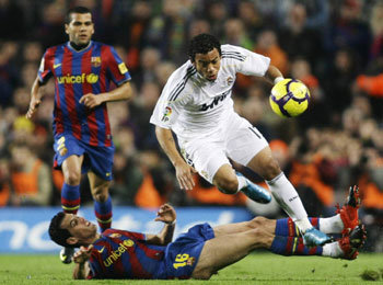 スペインリーグ・バルセロナのセルヒ・ブスケツ(下)が30日、ホーム球場のカンプ・ヌウスタジアムでレアル・マドリードのマルセロ(右側)に向かって強力なタックルを試みている。バルセロナは、後半11分、ズラタン・イブラヒモヴィッチの決勝ゴールに支えられ、1対0で勝った。レアルは今季、クリスティアーノ・ロナウドやカカなど、スター選手を迎え入れて最強を戦力を整えたが、後半起用されたイブラヒモヴィッチの決勝ゴールに涙を流すしかなかった。