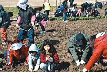 21日、国民体育振興公団の主催で、ソウル松坡区芳夷洞(ソンパク・バンイドン)のオリンピック公園で開かれた「春の菜の花苗植え」体験イベントで、家族連れの参加者が、約3万本の菜の花の苗木を植えている。植えられた苗木は、家族の月である5月に花が咲き、オリンピック公園を黄色に染めると、国民体育振興公団は説明した。