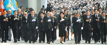 第55回顯忠日の追念式が6日、ソウル銅雀区銅雀洞(トンジャクグ・トンジャクドン)の国立ソウル顯忠院で執り行われた。李明博(イ・ミョンバク)大統領をはじめ各界の関係者らが同日、献花・焼香をするため、顯忠院に足を運んでいる。李大統領は、挨拶で護国英霊の名前を取り上げて、「あなたたちの名前は不滅です。この国、この民族を愛したこそ死さえ恐れなかったあなたたちに限りない尊敬と感謝を示します」と述べた。