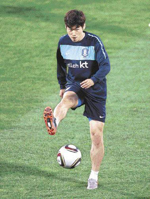 14日、ベースキャンプのラステンバーグ練習場で回復練習を行っているサッカーの韓国代表チームの主将・朴智星(パク・チソン)選手が、ボールをコントロールしながら調整を行っている。