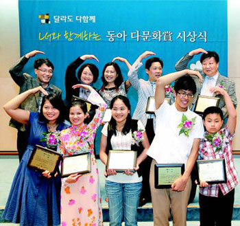 東亜(トンア)日報とLGが女性家族部後援で制定した「LGと共に東亜多文化賞」の授賞式が12日午後、ソウル中区太平路(チュング・テピョンロ)の韓国プレスセンター20階の国際会議場で行われた。前列の左側から、多文化家族部門受賞者のプティタイ・バスカンさん(慶南晋州市)、トゥンタユンさん(京畿高陽市)、クイェンキンプンさん(蔚山蔚州郡)、多文化青少年部門受賞者のヤン・ジョンミン君(忠南天安市中央高)、キム・チャンウ君(全北全州市八福小学校)、後列左側から、多文化貢献団体部門受賞者の釜山(プサン)アジア共同体学校のパク・ヒョソク代表、ソウル東大門区(トンデムング)多文化家族支援センターのオ・ユンジャセンター長、多文化貢献個人部門受賞者のキム・ヒジン京畿高陽市(キョンギ・コヤンシ)多文化家族支援センター課長、キム・ボング大田(テジョン)外国人移住労働者支援センター所長、ファン・ボムジュ仁川(インチョン)佳佐(カジャ)高校教頭。