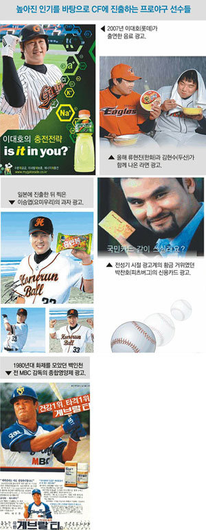 国内派選手らがCMを取り戻してきたのは、プロ野球の人気がよみがえった2〜3年前からだ。最高のCMスターとしてはロッテのホームラン打者、李大浩(イ・デホ)を挙げられる。07年釜山(プサン)銀行定期預金の紙面広告モデルを皮切りにスポーツ飲料のゲトレイとネオウィズのゲーム「スラッガー」の紙面広告に顔を出した。連続試合ホームラン世界新記録(9試合)を立てた先月はロッテデパートが李大浩を売り物にした広告を流した。
