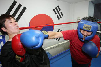 グローブをはめて拳を振り回すのは、まるで服を着こんで水泳をするのと似ている。スローモーションのような腕力沙汰は初心者としても全力をふり絞らなければならない。本紙のスポーツレジャー部のキム・ソンギュ記者(右側)が基本技だけを身につけてリングに上がってボクシング経歴7ヵ月のイ・ハクリョルさんを相手に腕を伸ばしている。