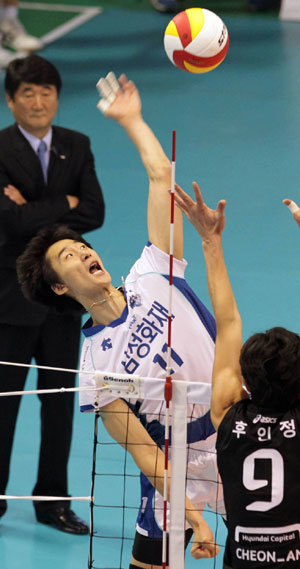 삼성화재 라이트 박철우(가운데)가 신치용 감독(왼쪽)이 지켜보는 가운데 현대캐피탈 후인정의 블로킹을 앞에 놓고 스파이크를 하고 있다. 박철우는 16점을 올리며 친정 팀을 꺾는 데 앞장섰다. 대전