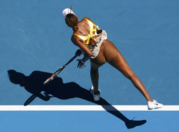 ビーナス・ウィリアムズ(米国)が19日、テニス全豪オープン女子シングルス2回戦で、サンドラ・ザフラボバ(チェコ)に強力なサーブを浴びせている。テニスウェアがまくり上がり、腰が見えている。ウィリアムズは、昨年の全豪オープンでも露出度の高いウェアが話題となった。ウィリアムズが2対1で勝利した。